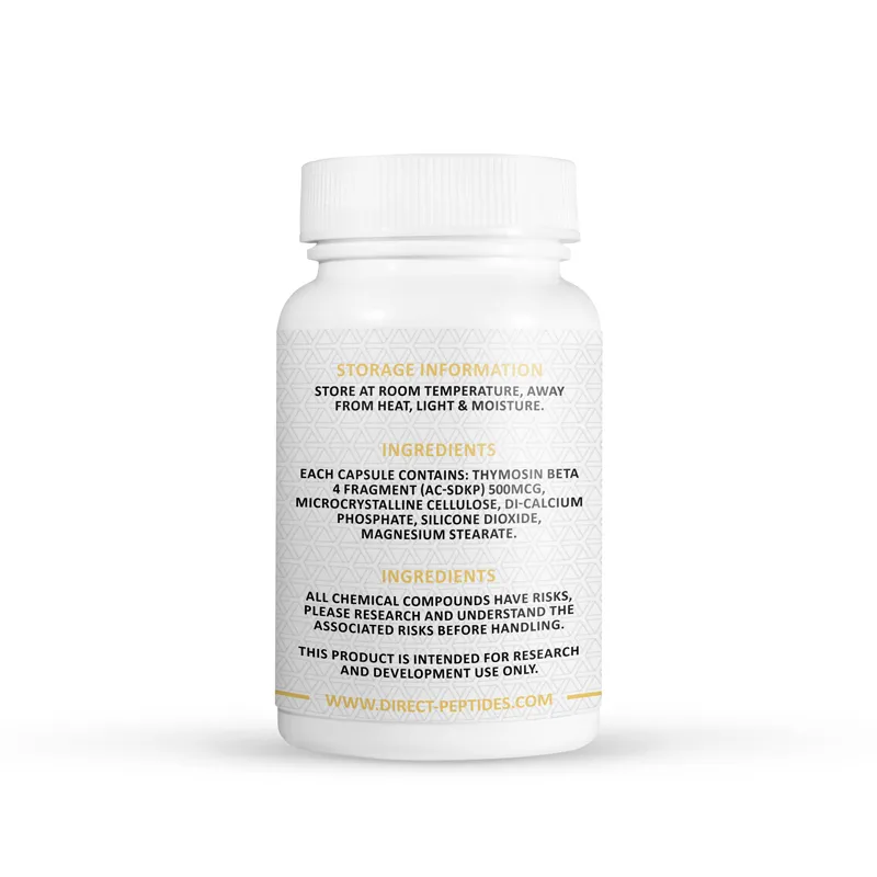 Buy Thymosin Beta-4 Fragment Capsules Ireland, Ac-SDKP 500mcg are intended for research use only and should only be handled by trained professionals. These capsules contain Ac-SDKP, a tetrapeptide from thymosin beta-4 (TB-4), known for its role in supporting tissue regeneration, angiogenesis, and managing inflammatory responses.